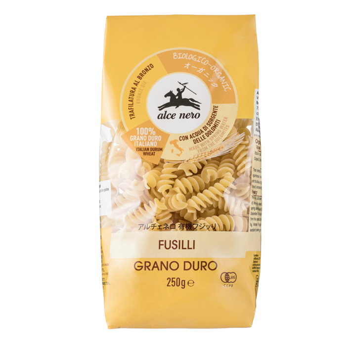The precise production process of The Alce Nero organic durum wheat penne rigate and a dough that uses spring water from the Trentino Alps, results in a pasta that holds its shape perfectly when cooked. The Alce Nero organic durum wheat fusilli are ideal for cold meals, pasta salads and timballi.